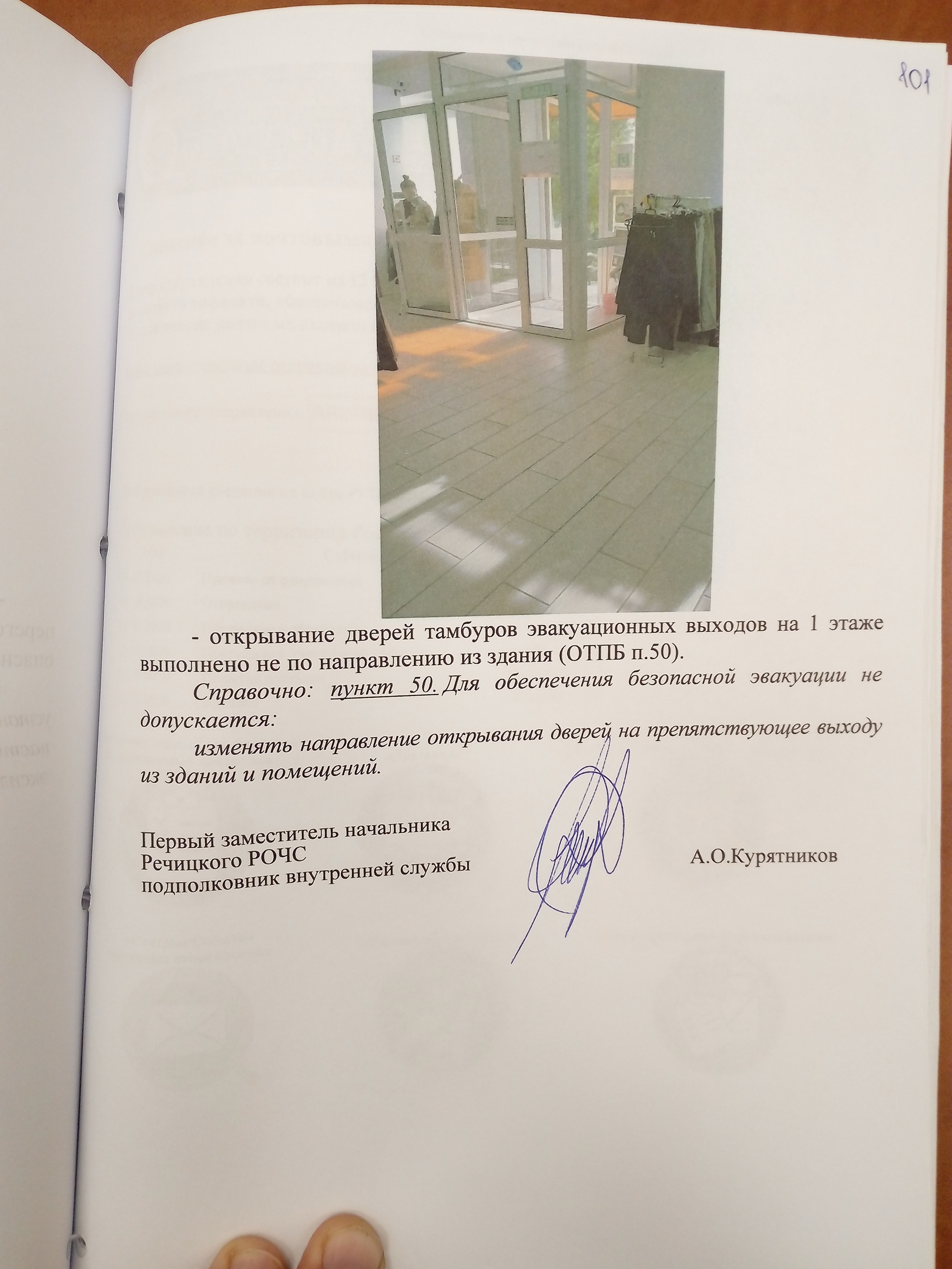 - открывание дверей тамбуров на первом этаже выполнено не по направлению из здания.
