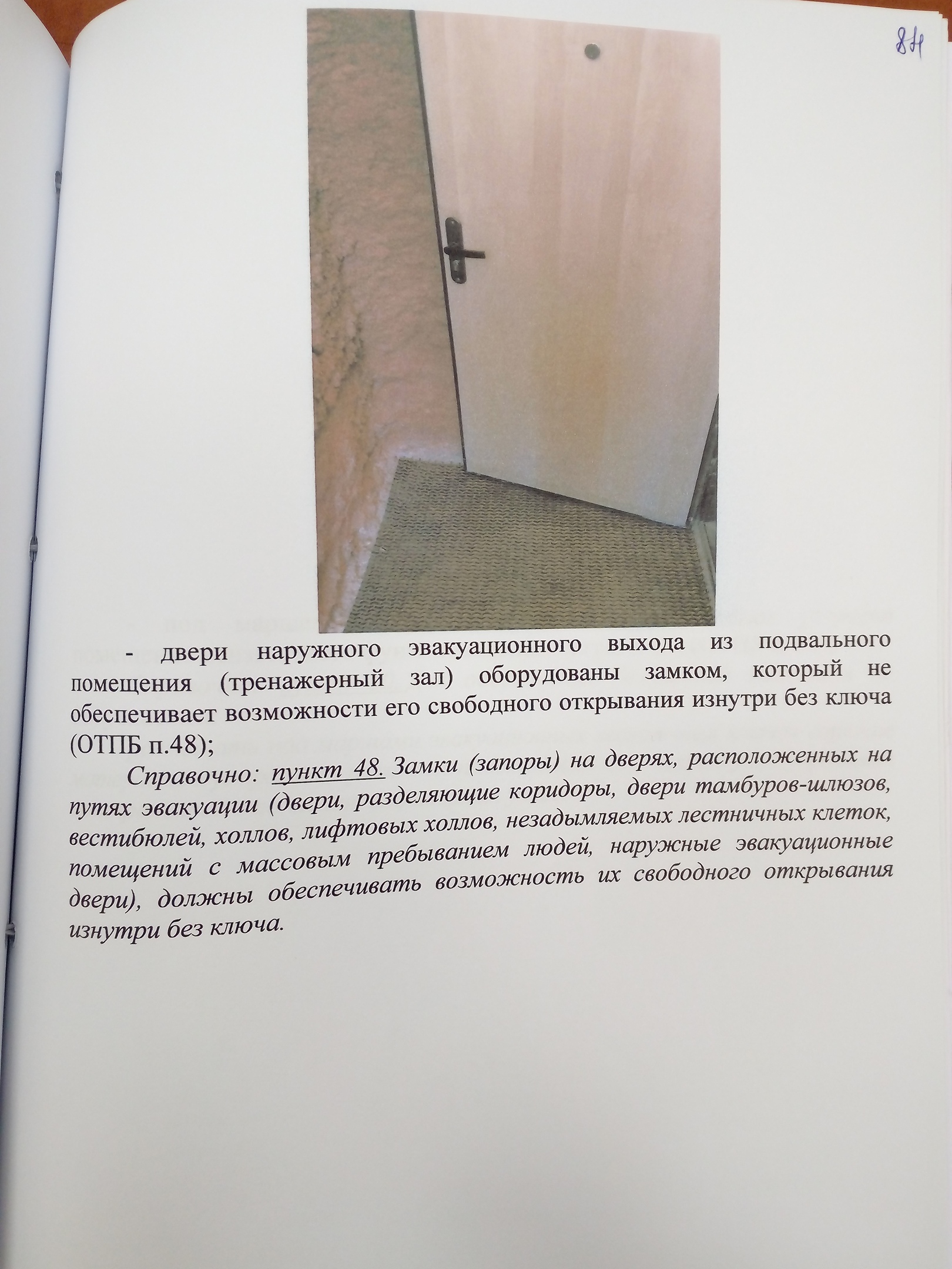 - дверь одного из выходов из подвального помещения, где находится тренажерный зал имеет замок, который не обеспечивает его открытие изнутри без ключа;