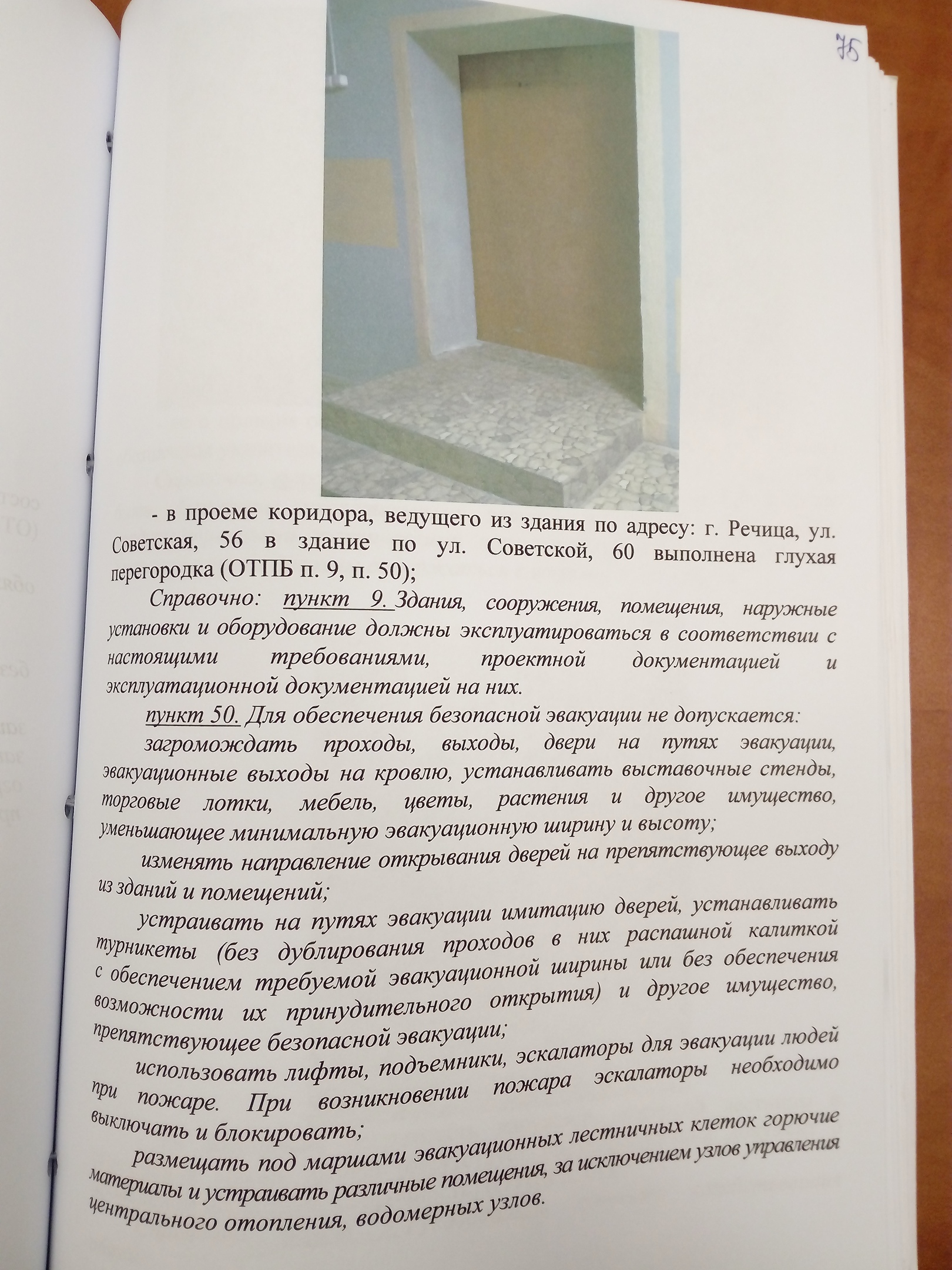 19 ноября речицкая государственная газета «Дняпровец» со ссылкой на инспекцию надзора и профилактики Речицкого РОЧС сообщила, что на основании решения Экономического суда Гомельской области «приостановлена деятельность зданий, принадлежащих на праве хозяйственного ведения ЧУП по оказанию услуг «Кондратенко А. М.», расположенных по адресу: г. Речица, ул. Советская № 56, 56А, 56Е, 60, 62, до устранения выявленных нарушений законодательства о пожарной безопасности, непосредственно создающих угрозу жизни и здоровью граждан». Субъектам, расположенным по указанным адресам предписывается «прекратить осуществление деятельности своих организаций».