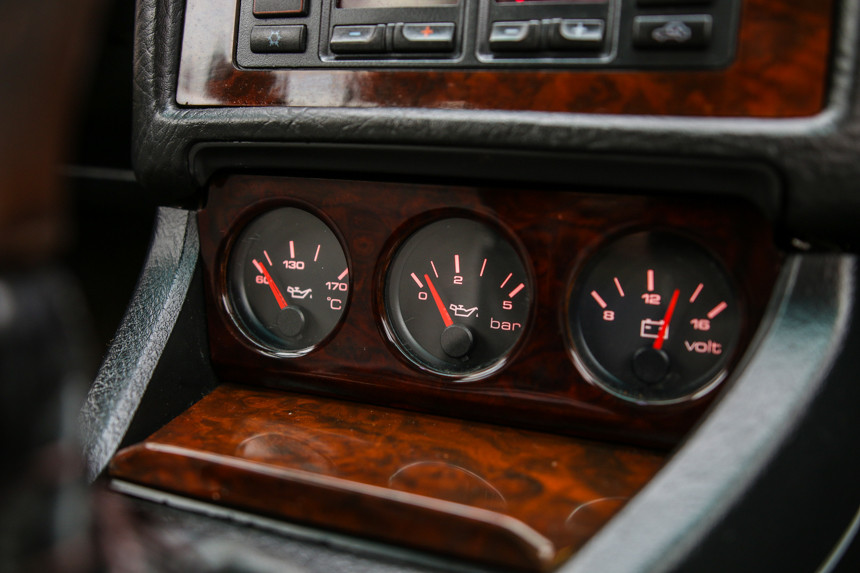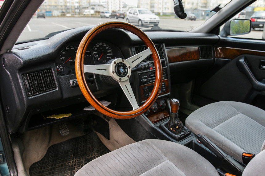 В салоне есть круиз-контроль и дополнительные приборы с указателями давления и температуры масла, напряжения в бортовой сети. Деревянный руль ручной работы снят с Audi 80. Это тоже не «колхоз», такие устанавливались, хоть и редко.