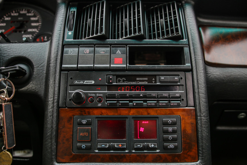 Деревянные элементы салона собирались по крупицам из разных стран и городов. Установлена редкая магнитола Bose от A6 C4 USA с возможностью выведения информации радиочастоты и номера играющего трека на экран щитка приборов. Динамики в задних картах – среднечастотные Bose размерностью на 16 от Audi A6 C5, также оригинальные высокочастотные динамики Nokia. Передние динамики – Bose от Audi А8 В2. Все подключено через четырехканальный усилитель Bose от A6 C5 Avant. В нише багажника установлен сабвуфер с самодельным корпусом и головным устройством Bose от A6 С5. Магнитола читает музыку формата AudioCD через заводской чейнджер на 10 дисков. Качество звука довольно неплохое, для моих целей мне хватает, я не участвую в соревнованиях по звуку.