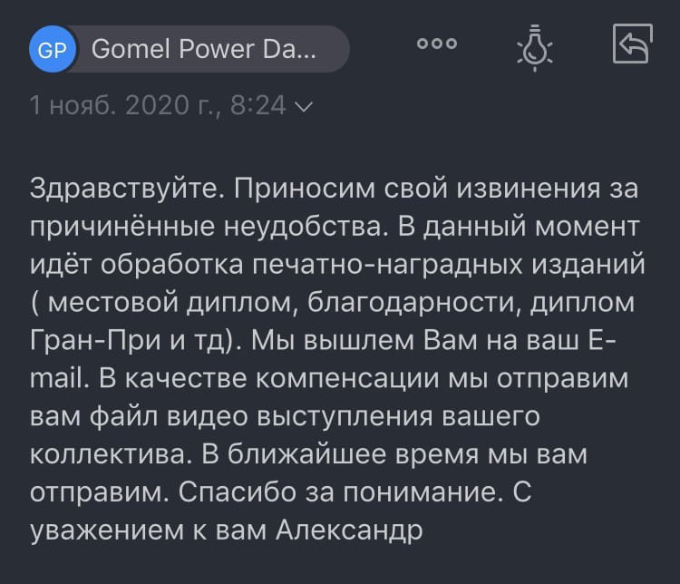 После глобального фестиваля прошел почти месяц, и какие-то ошибки за это время можно было исправить. Однако люди, с которыми мы общались, не получили чего хотели. Витебчанам последний ответ поступил 1 ноября. В нем Александр приносил извинения за причиненные неудобства и сообщил, что на данный момент идет обработка печатно-наградных изданий, а на имейл коллектива в качестве компенсации планируется отправить видеофайл его выступления. Но ничего до сих пор не пришло.