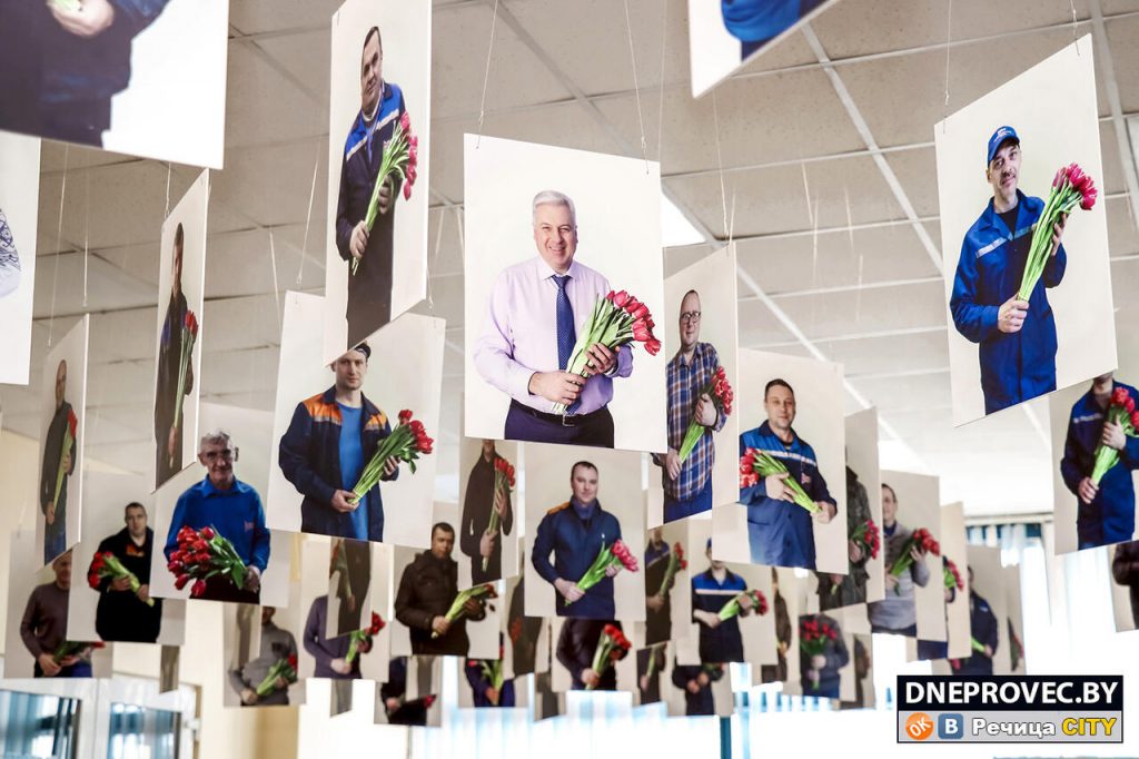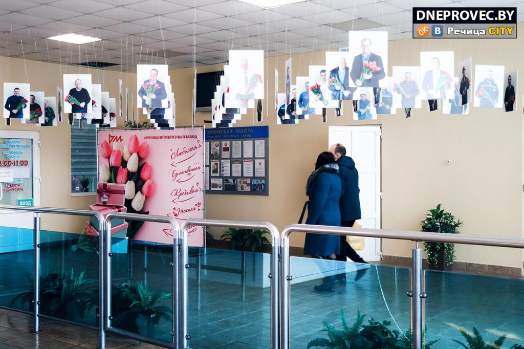 За несколько дней до праздника на проходной завода царило праздничное настроение. По всему холлу были развешены портреты мужчин-заводчан, которые держали в руках цветы и поздравляли женщин с праздником, пишет «Дняпровец».